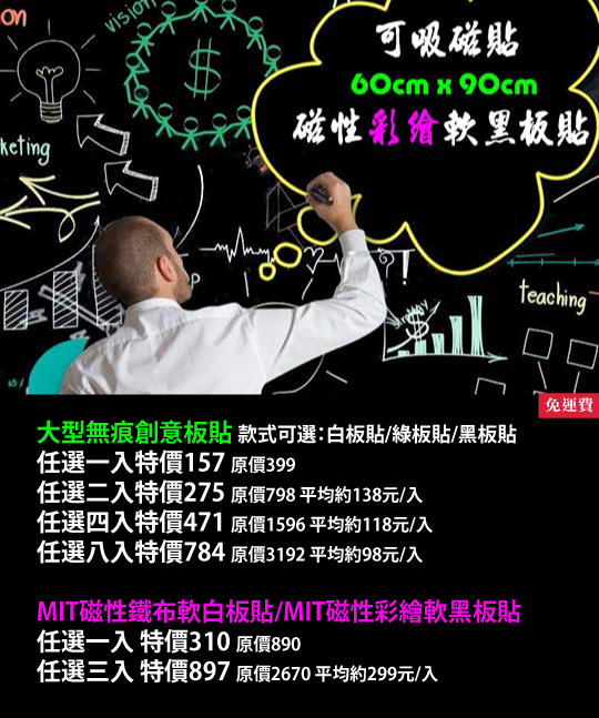 【大型無痕創意板貼/MIT磁性鐵布軟白板貼/MIT磁性彩繪軟黑板貼】讓孩子發揮想像力、記事開會也更方便!可反覆擦寫、並依需求裁切或拼貼,滿足各種環境使用!只要157元起,即可享有大型無痕創意板貼/MIT磁性鐵布軟白板貼/MIT磁性彩繪軟黑板貼等組合