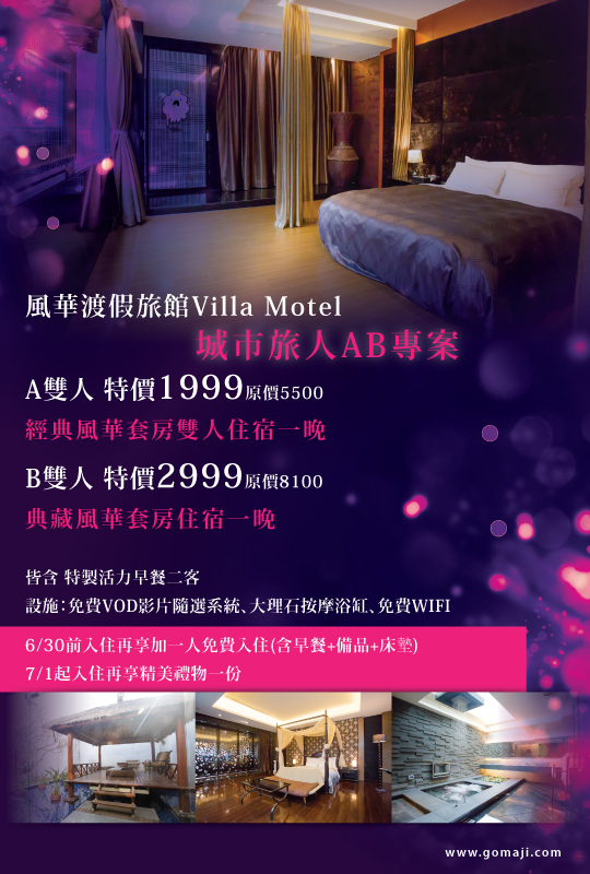 只要1999元起,即可享有【雲林-風華渡假旅館Villa Motel】城市旅人AB專案〈含A.經典風華套房/B.典藏風華套房 雙人住宿一晚 + 特製活力早餐二客 + 設施:免費VOD影片隨選系統、大理石按摩浴缸、免費WIFI〉6/30前入住再享加一人免費入住(含早餐+備品+床墊),7/1起入住再享精美禮物一份