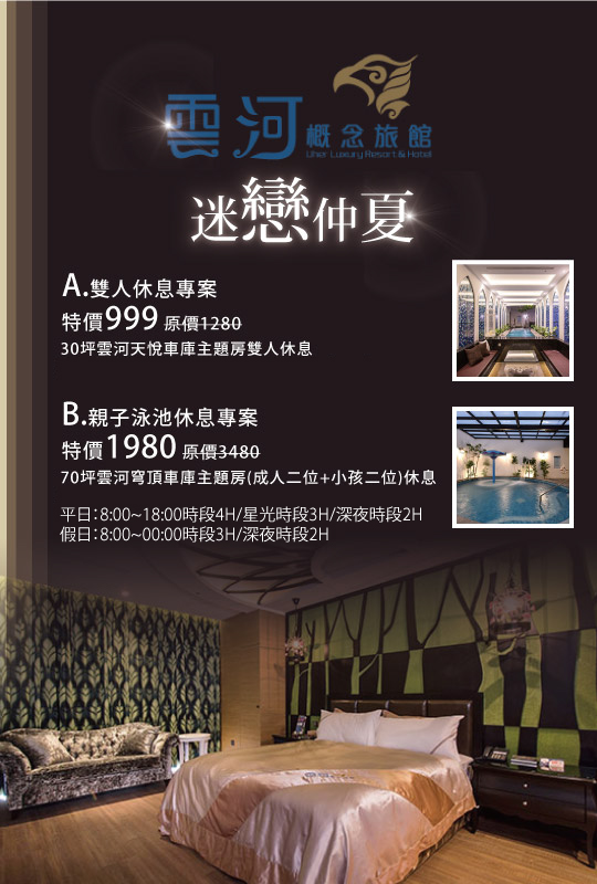 只要999元起,即可享有【台中-雲河概念旅館 】迷戀仲夏A.雙人/B.親子泳池休息專案〈含A.30坪雲河天悅車庫主題房雙人休息/B.70坪雲河穹頂車庫主題房(成人二位+小孩二位),平日:8:00~18:00時段4H/星光時段3H/深夜時段2H;假日:8:00~00:00時段3H/深夜時段2H〉